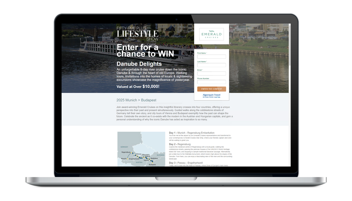 Founded in 2013 as Emerald Waterways, Emerald Cruises is an award-winning travel operator specializing in deluxe river cruises and luxury yacht cruising. To get their brand out there we supplied a complete spectrum of marketing services – custom exhibit space and contesting at our Fifty-Five Plus Lifestyle Show, multiple e-blast to our 30,000-subscriber list that included the premium print advertisement with our Fifty-Five Plus and LUXE Magazines.